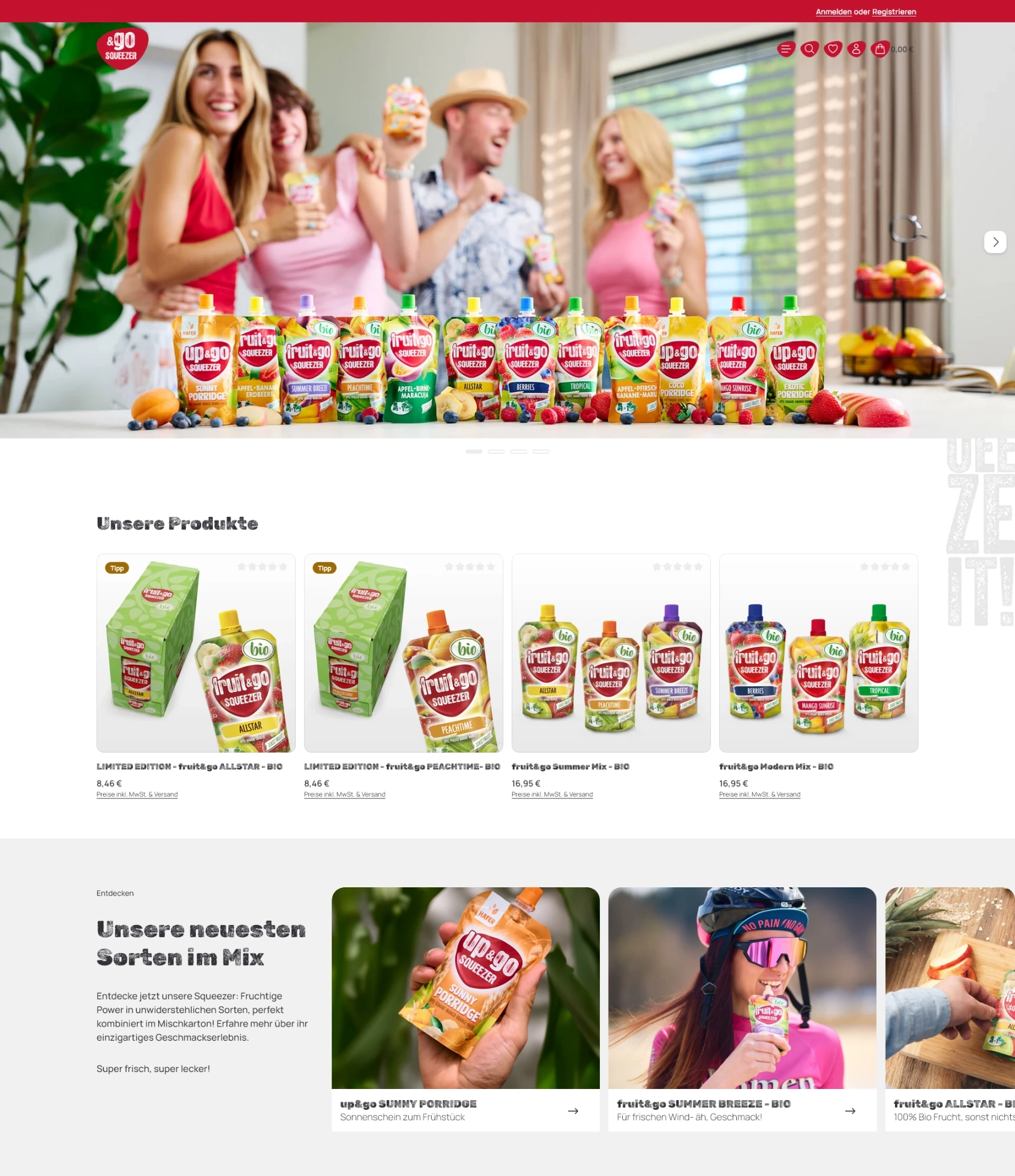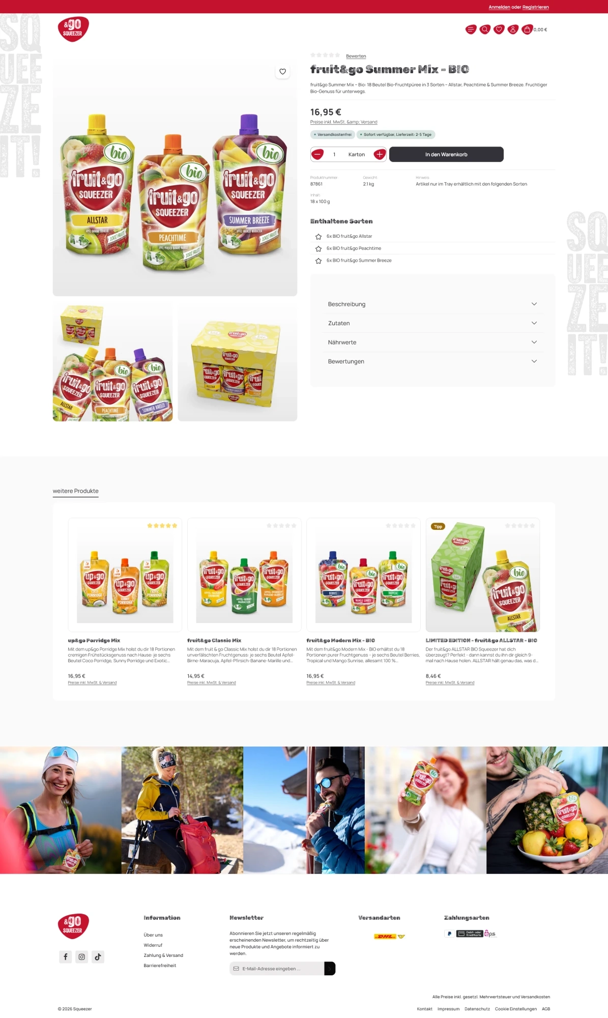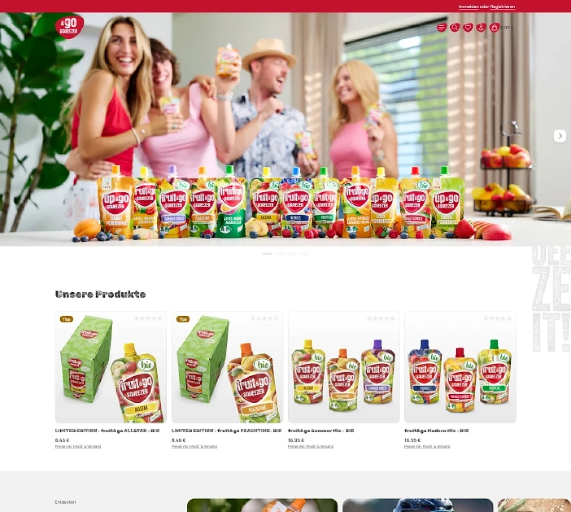 Design und Benutzerführung orientieren sich konsequent an der Markenwelt von Squeezer. Farben, Bildsprache und Struktur unterstützen eine emotionale Produktpräsentation und fördern eine intuitive Navigation.