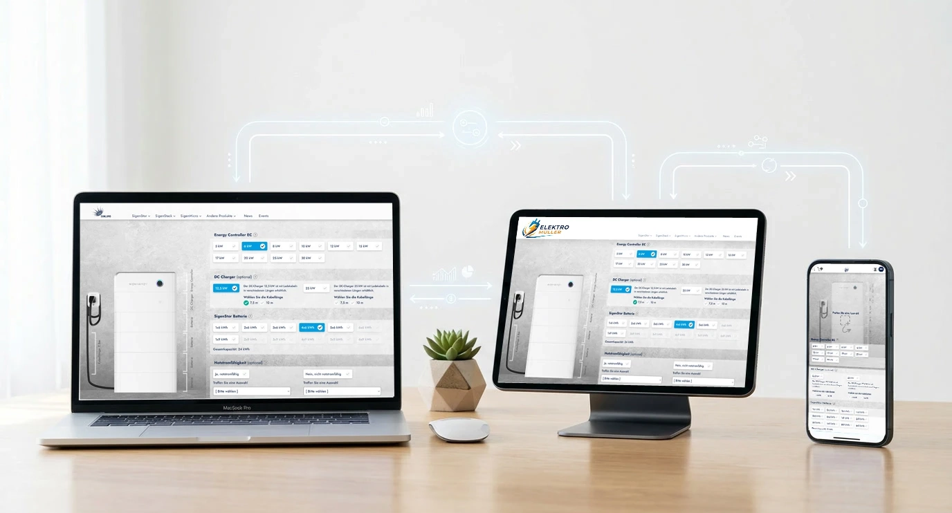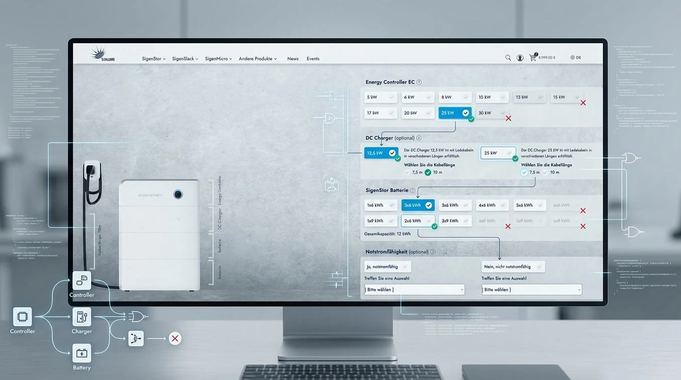Für unseren Kunden Sunlumo Technology GmbH haben wir einen modularen Produktkonfigurator entwickelt, der eine maßgeschneiderte Zusammenstellung des SigenStor Systems ermöglicht. Die Nutzer:innen können Komponenten wie den Controller, Batteriemodule und weiteres Zubehör frei kombinieren – und erhalten dabei in Echtzeit eine Preisübersicht sowie eine technische Zusammenfassung der Auswahl.